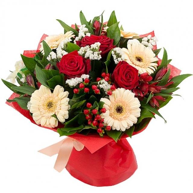 Букет, состоящий из гербер, роз и альстромерий – образец элегантности и изыска. Каждый цветок несет светлый послы и означает хорошее отношение, теплые чувства и улыбку. Сочетание не вызовет смущения и понравится каждому роскошным внешним видом и приятным ароматом, от которого хочется побыстрее отправиться на природу вдыхать свежие запахи.